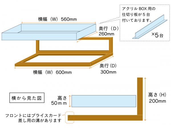 仕切り板が取り外し出来ますので、商品のサイズに合わせて陳列出来ます。