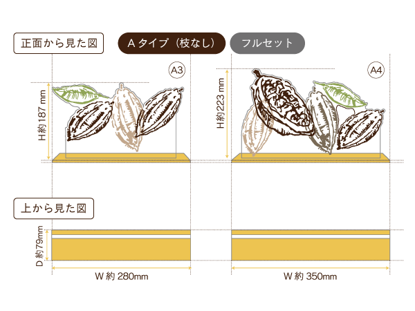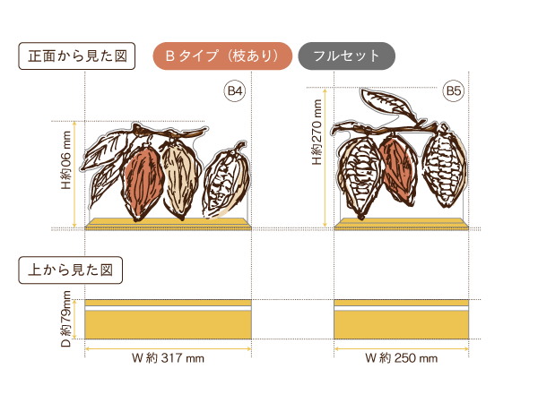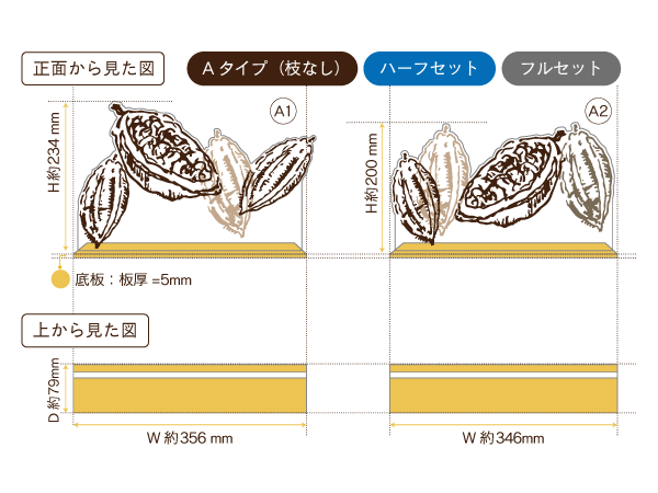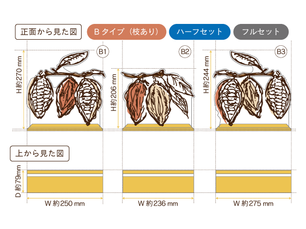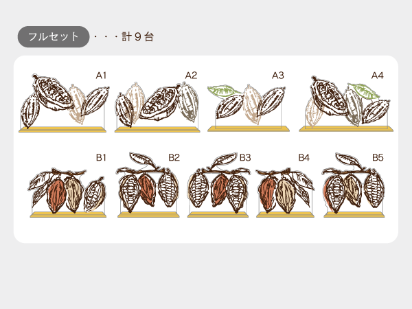 【 フルセット 】・・・枝あり・なしイラストの全種類揃ったカカオオブジェ9台セットです。